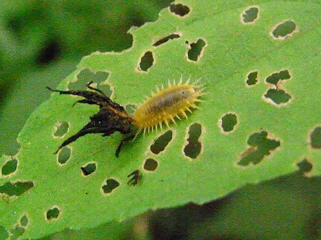 孵化した幼虫は脱皮殻などを身につけてカモフラージュする。