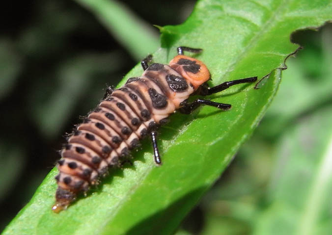 トホシテントウは成虫も幼虫もハムシの幼虫などを食べる。