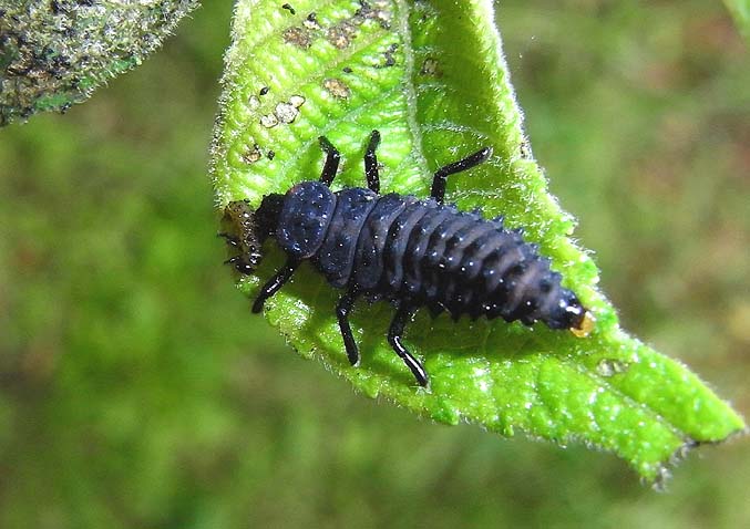 カメノコテントウの成虫と幼虫(クルミハムシの幼虫を捕食中)。