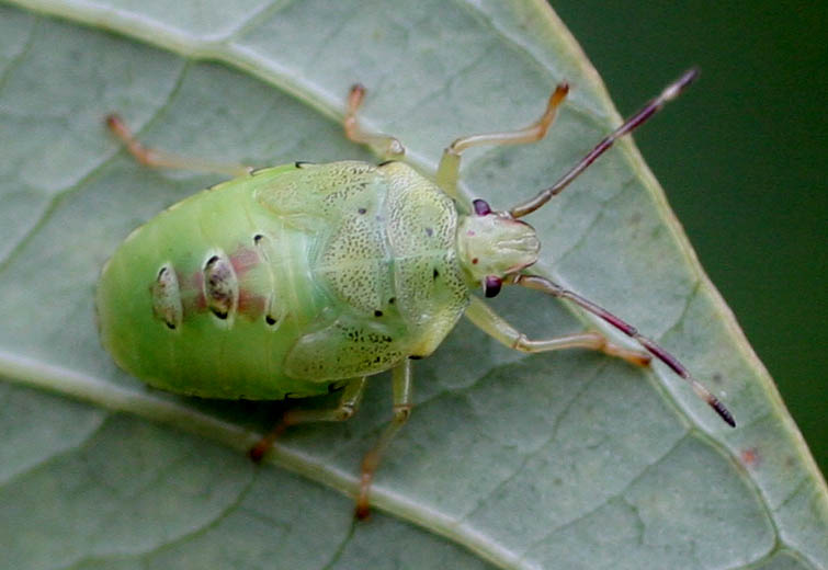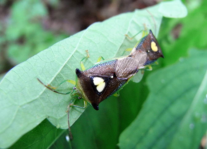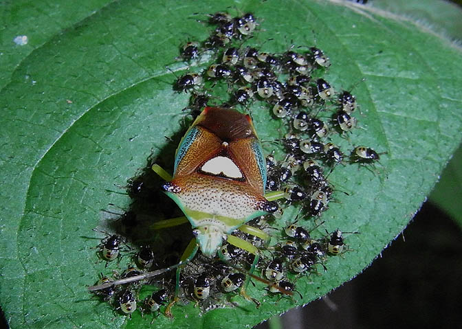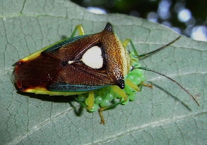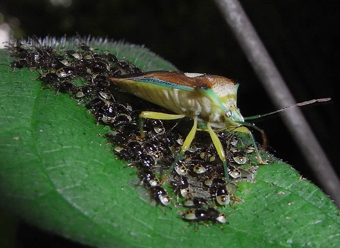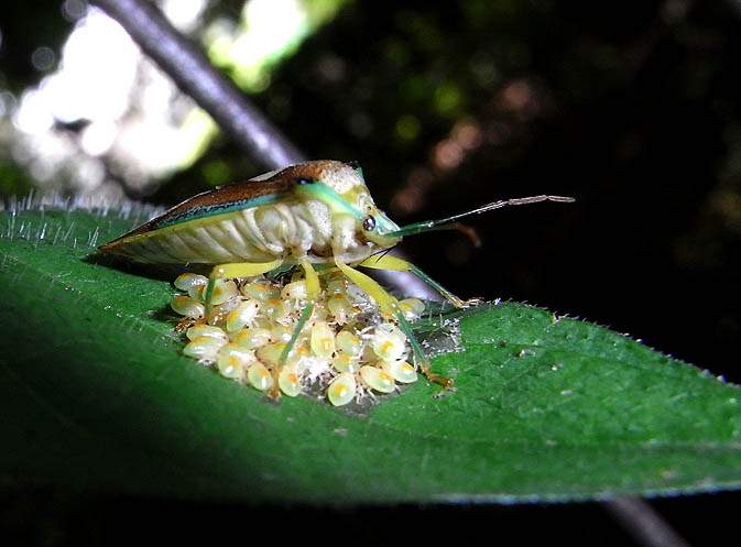 産卵(ミズキの葉裏あるいはミズキの側の木の葉に産卵) メスは卵を守る