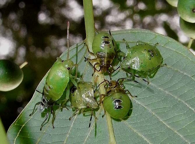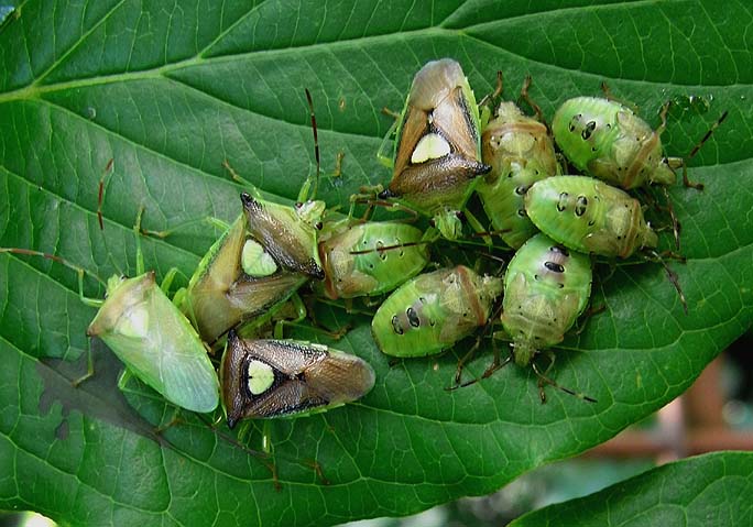 年1化、成虫越冬。幼虫は6月下旬ごろから現れ、1ヶ月ほどで羽化する。 親は産卵後から卵と幼虫を保護する習性がある。 幼虫は全令期を通して集合性がある。 食物:サンショウ・ミズキなどの実を吸汁。