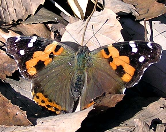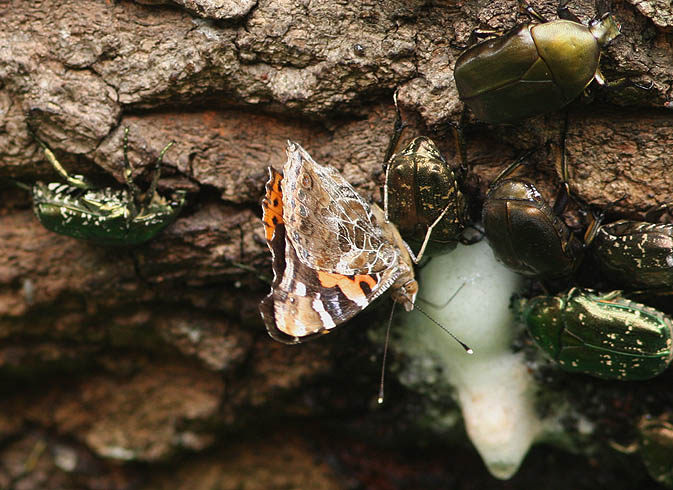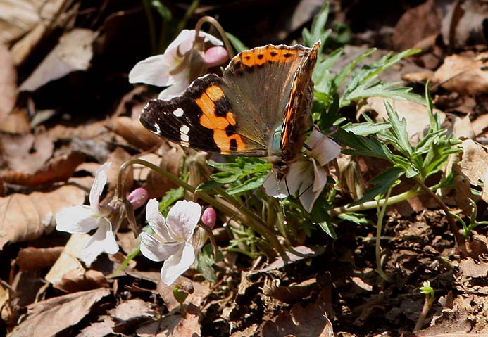 左:甲虫たちの間に割り込んで樹液を吸うアカタテハ 右:越冬開けにスミレの蜜を吸うアカタテハ。